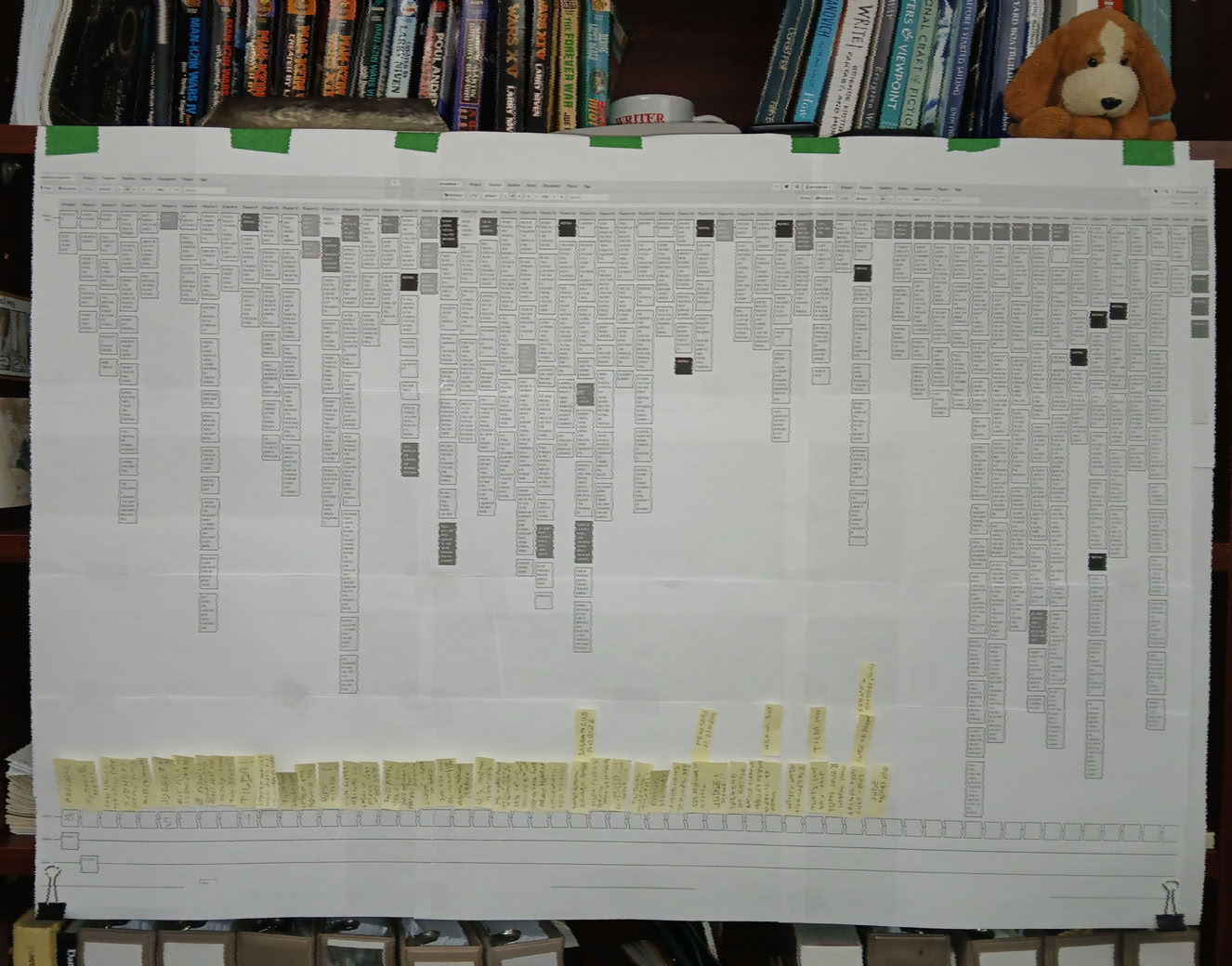 In the image below, you can see the strips of Post-it notes near the bottom of the printout. It is summarized up to the big battle. The big battle and the ending are not done yet. The big battle is nine (9) chapters long. Nine, yes 9. Jesus.